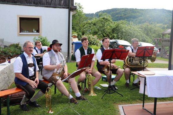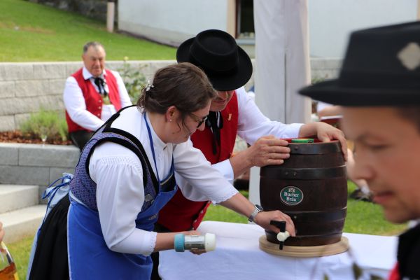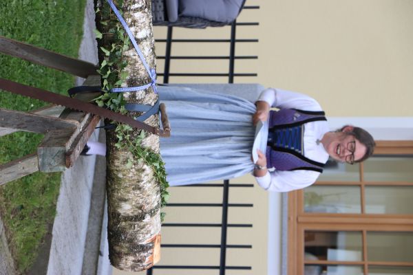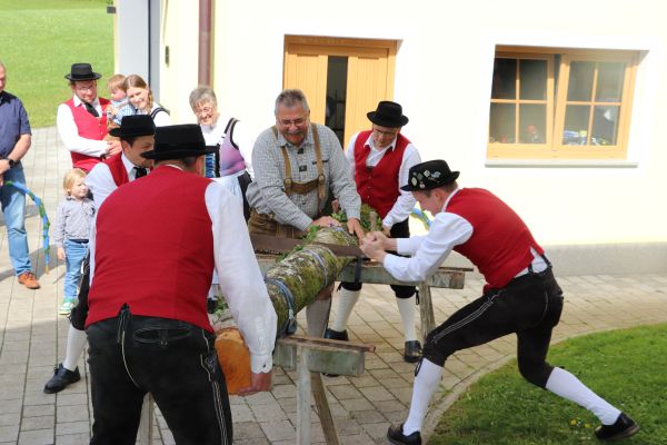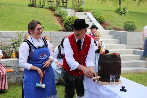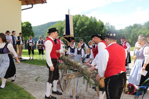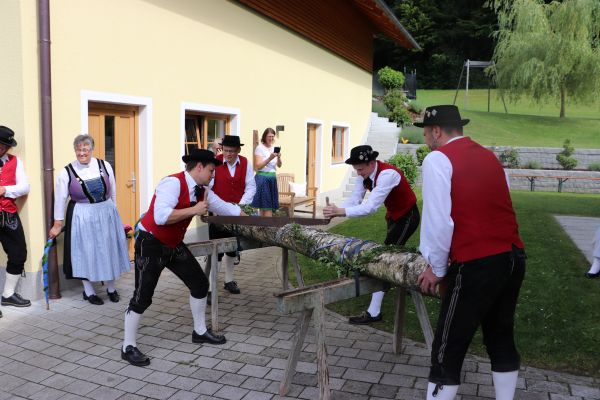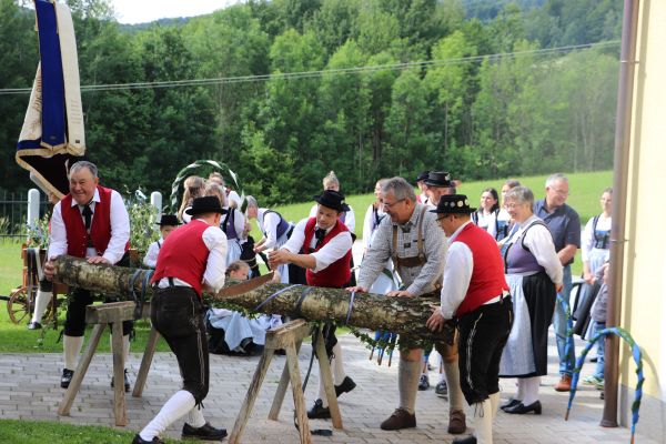 Petra Drexler, selbst mit ihrer Familie eine hundertprozentige Trachtlerin, hat sich schließlich bereit erklärt, das Amt der Fahnenmutter als Nachfolgerin der bisherigen Fahnenmutter Therese Jell zu übernehmen. So fand sich kürzlich eine starke Abordnung bei ihr in Wolfersreut zum Fahnenmutterbitten ein. Bevor sie das erlösende Ja-Wort zur Übernahme des Amts für den Heimatverein Buchberg aussprach, mussten die Mitglieder zahlreiche Aufgaben erfüllen. Eine herausfordernde Aufgabe war dabei das traditionelle Durchsägen eines Baumstammes, welches mit Unterstützung der Bläser "Sechser-Blech" aus Ringelai mit einigen musikalischen Einlagen schließlich doch zum Erfolg führte. Nach dieser ersten Aufgabe musste Petra Drexler das von den Bittstellern und von der Brauerei Bucher gespendete Faß Bier anzapfen - und es wurde sogleich auf Petra angestoßen. Für das leibliche Wohl hatte sie bestens gesorgt.