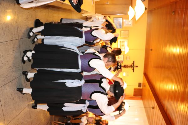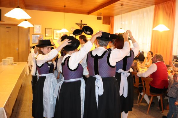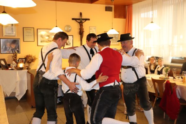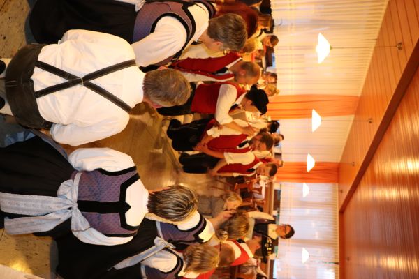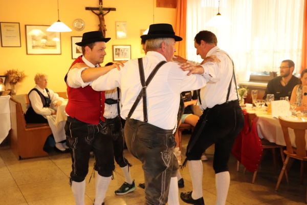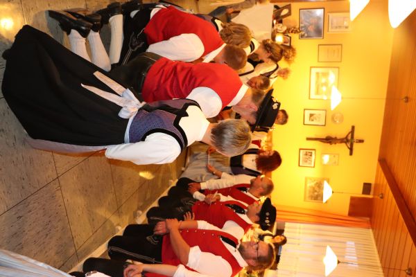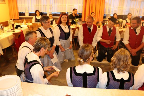 Anschließend lud Petra ins Gasthaus Piser nach Hohenau zum gemeinsamen Abendessen ein. Nach dieser Stärkung stellte sie die Mitglieder des Heimatvereins mit weiteren Aufgaben auf die Probe. Zum Huttausch waren alle Kinder und Erwachsenen aufgerufen. Auch die Schuhplattler forderte Petra zu einer Einlage heraus. Nun erhoffte sich die Vorstandschaft doch endlich das "Ja-Wort" und bat darum. Aber Petra hatte noch weitere Tests auf Lager. Wie es sich für einen Trachtenverein gehöre, müssw auch gesungen werden und so stimmte man das Heimatlied "Mia san vom Woid dahoam" an.