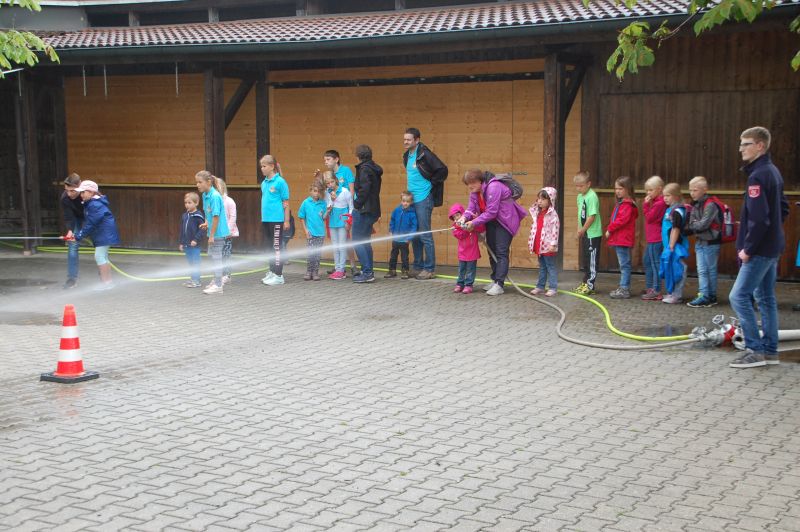 Das regnerische Wetter machte allen nichts aus – im Gegenteil. Dem Regen von oben, halfen die jungen Trachtler mit Wasser aus dem Schlauch der FFW Würding nach. Die Feuerwehrler hatten hinter dem Bürgerhaus ein Zielspritzen aufgebaut.