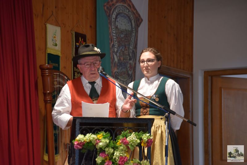 „Wie hat es eigentlich angefangen?“, war die Frage von Anna Möckl an ihren Opa Adolf Möckl. Zusammen haben die beiden die Geschichte und die Arbeit der Freudenseer vorgestellt und den Gästen nähergebracht. Mit vielen Bildern aus 75 Jahren Vereinsgeschichte machten sie die Arbeit des Trachtenvereins und seiner Gruppen greifbar. Und so mancher musste auch eingestehen, dass es ihm nicht bewusst war, was die Freudenseer alles machen. Alois Haydn, 2. Gauvorstand, konnte zu dieser Arbeit nur eines sagen: „Hut ab!“